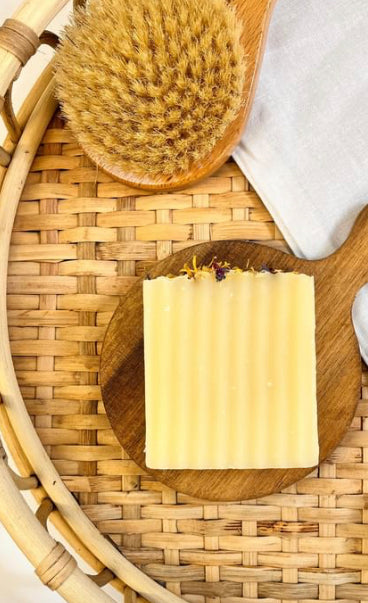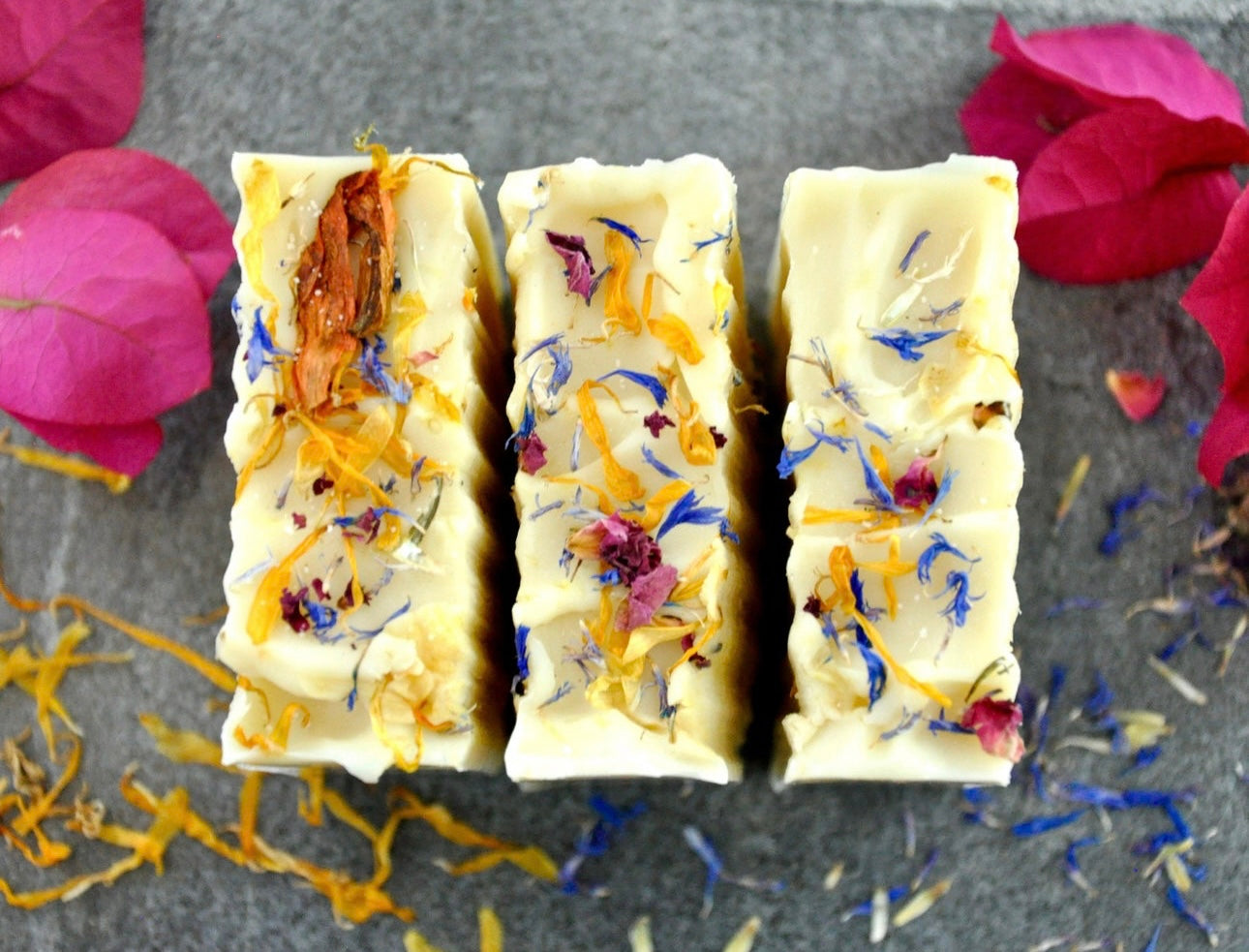 { I N G R E D I E N T S }: organic olive oil, organic coconut oil, organic sweet almond oil, organic argan oil, organic shea butter, organic cocoa butter, lye, distilled water, fragrance oil, dried blue cornflowers, dried lilies