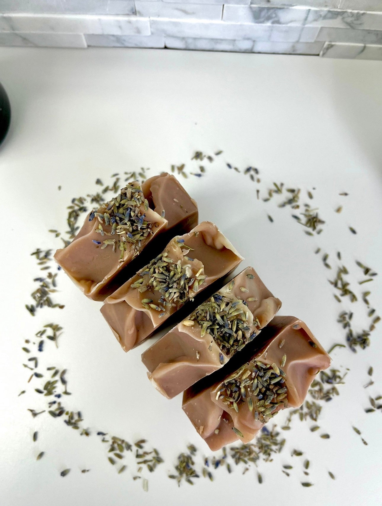 Lather yourself in this luxurious homemade Organic Lavender Soap Bar. This zero waste soap will leave you feeling refreshed and ready to start your day. It contains shea butter and small hints of cocoa butter to moisturize your skin feeling revived! This cold processed soap holds a delicate look with a small amount of dried lavender buds at the top.